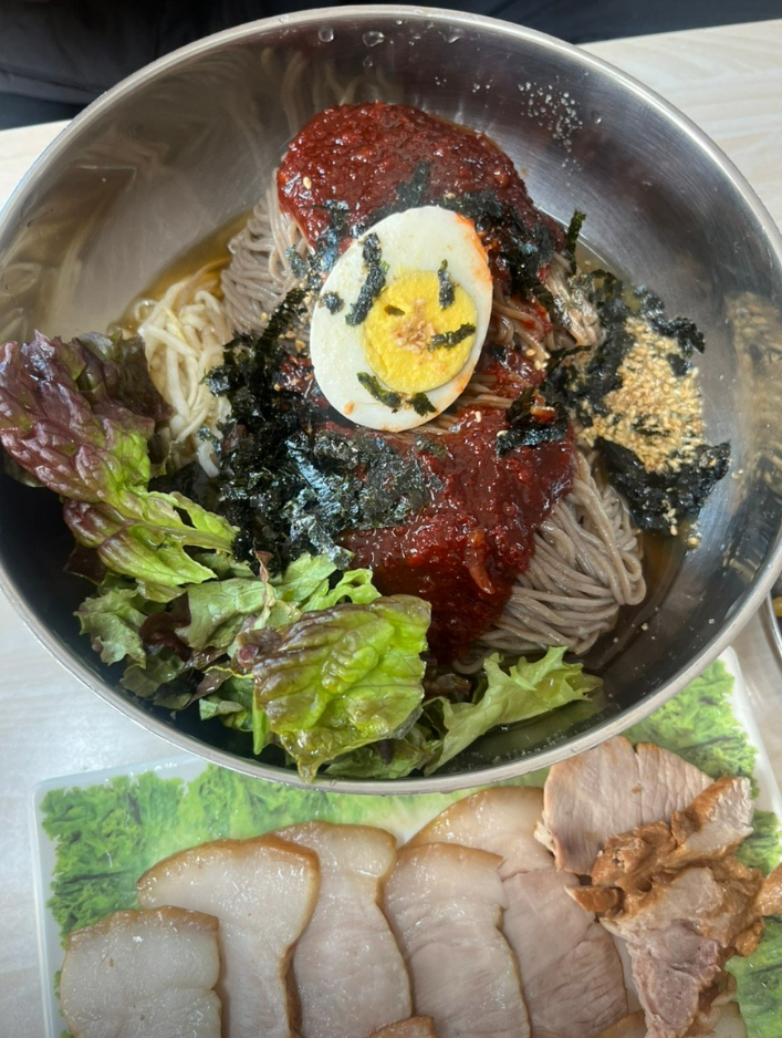 "막국수 양념이 자극적이지 않아 아이랑 먹기 좋아요. 수육은 기름기 없이 담백하고, 양념무침도 맛있어서 가족 모두 만족했습니다. 백반기행 보고 방문했는데 기대 이상이었어요!"