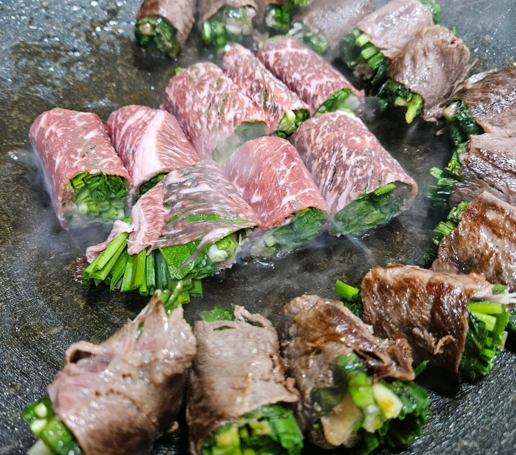 샤브샤브용 얇은 한우 고기에 파채를 돌돌 말아 초벌구이 후 식용유를 살짝 두른 팬에 직접 구워 먹는 방식으로, 손이 많이 가지만 그만큼 정성이 담겨 있습니다.